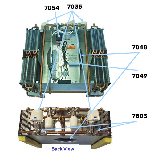 The heating-unit 3004 W is installed in the foundation slab and contains a fan and 2 water/air-exchangers, with control valves that are controlled by 1 or 2 external electric room thermostats.