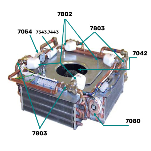 The 4000W-24 heating unit is installed in the foundation slab or suspended floor, and contains a fan and four water/air-exchangers, with valves that are controlled by 1-4 external electric room thermostats. It is used together with heating unit box 4000A 100/100 (4″/100 mm spiral pipes) or with heating unit box 4000A 50/50 (2″/50 mm plastic pipes)