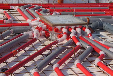As soon as concrete is poured, a Legalett Construction Heater can be connected to the pipe-heating system. This effectively dries out the slab evenly, a process that can continue throughout the construction period. In addition to extending the construction season, this has advantages for the entire building process. Painting and floor laying can be carried out at an earlier stage than with conventional construction methods. (Traditional building heaters need not be used in cold weather.)
